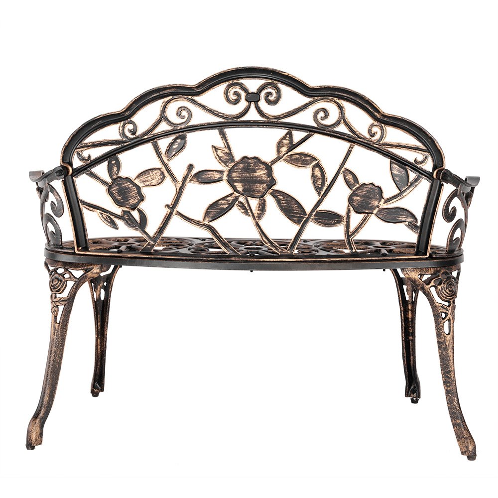 Introductions:This beautifully designed powder coated chair will add elegance to your front or backyard, which will be a great addition to garden or make a completion for your path. The highlight is the hollowed rose design. This bench features powder-coat steel construction to deliver durability and light weight, and the antique finish adds an attractive look to your patio or deck. The stylish design on the backrest provides a stylish look, and the bench is easy to assemble. Beautifully designed powder coated bench will add elegance to your front or backyard, ideal for along a path, under a tree, among the flowers or in your favorite peaceful spot.Features:1. Solid legs provide safe place to sit and relax2. Surface painted and rust resistant3. Easy to clean with damp cloth4. Hardware included for easy assembly5. Two armrests provide place to rest your armsSpecifications:1. Color: Bronze2. Material: Cast Aluminum & Iron3. Highest Point to Ground: 31" / 78.7cm4. Handrail to Ground: 22.25" / 56.5cm5. Total Length: 38.5" / 97.8cm6. Seats to The Ground: 16.25" / 41.3cm7. Horizontal Inner Spacing of Support Legs: 29.25" / 74.3cm8. Longitudinal Inner Spacing of Support Legs: 16.75" / 42.6cm9. Seat Plate Depth: (13.5-13)" / (34.3-33)cm10. Seat Plate Width: 33.75" / 85.7cm11. Weight: 21.87lbs / 9.84kgPackage Includes:1 x Double Bench1 x Hardware Accessories Bag