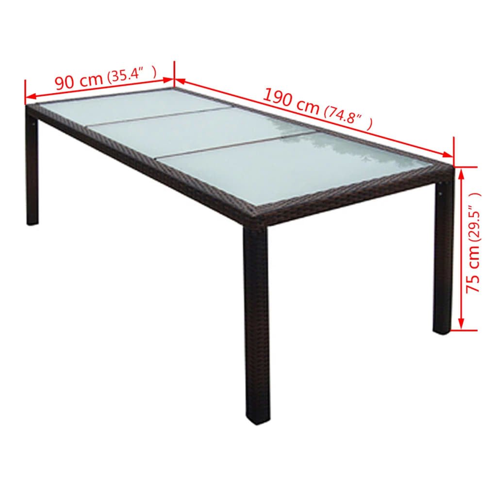 Note 2): This item will be shipped flat packed. Assembly is required; all tools, hardware and instructions are included.Rattan color: BrownMaterial: Steel frame + aluminum feetCushion material: 100% polyesterTable size: 74.8"x 35.4" x 29.5" (L x W x H)Chair size: 22.8" x 24" x 34.6" (W x D x H)Easy to assembleDelivery includes 1 table with a glass top, 8 rattan chairs and 8 removable seat cushionsWARNING Cushion and pad are only for outdoor use. Do not take them inside of dwelling
