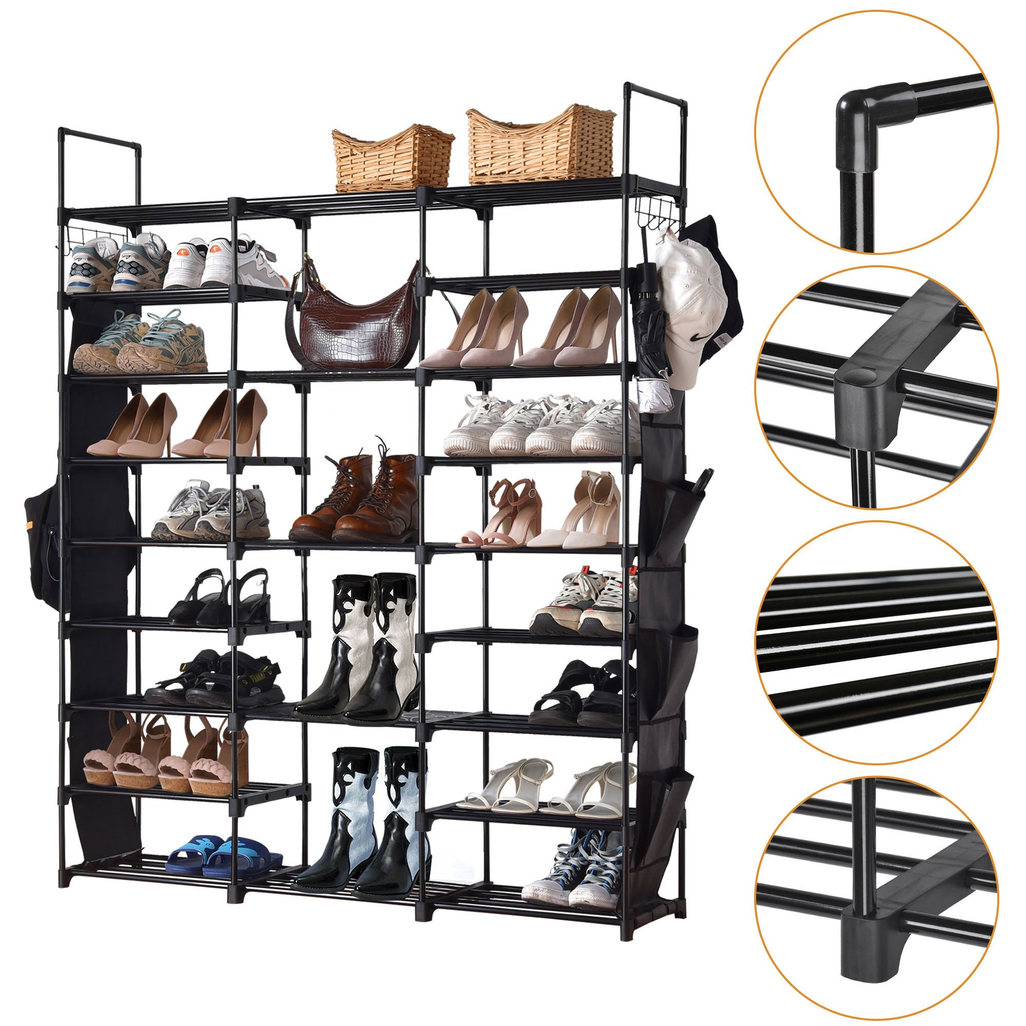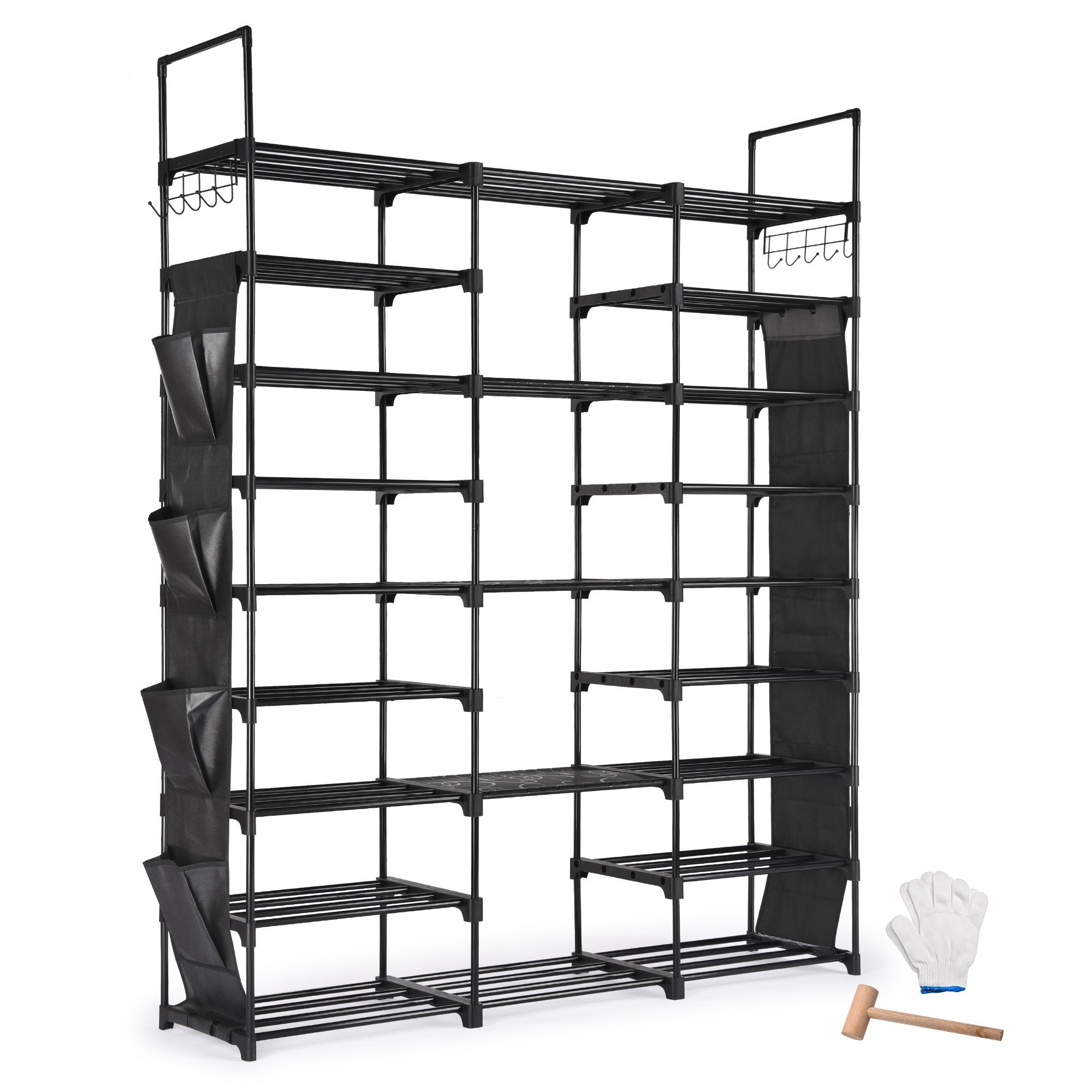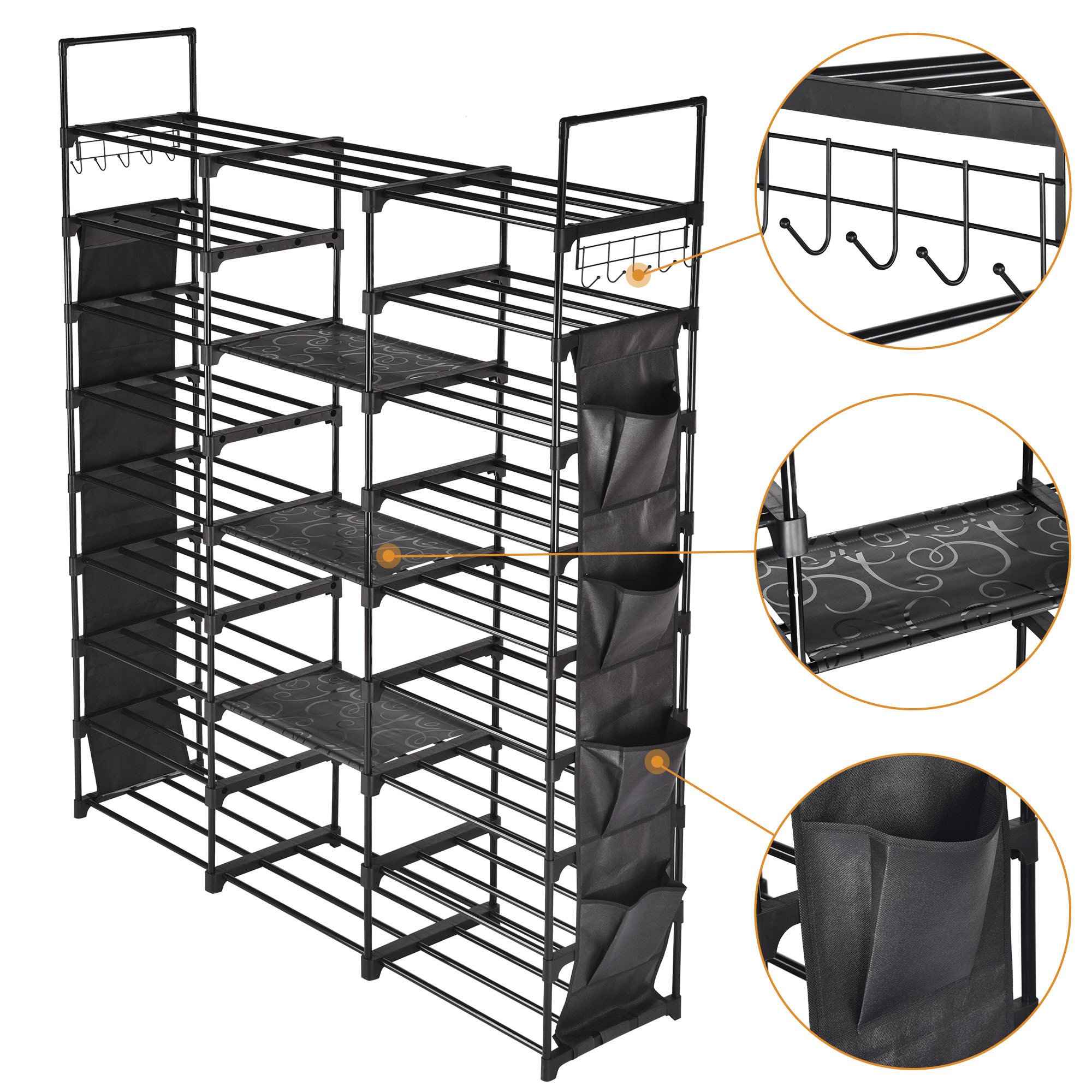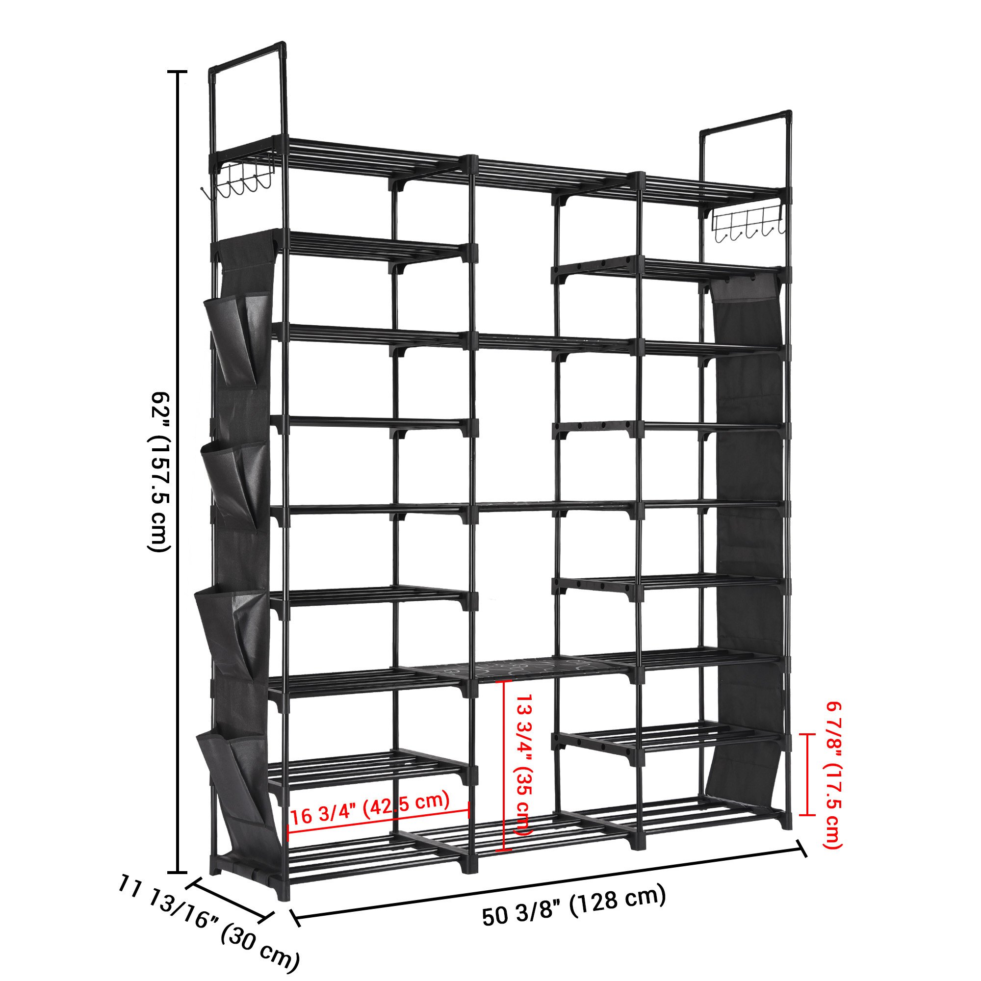 - Large Capacity - 50 3/8" x 11 13/16" x 62" 9-tier Shoe Rack with 9 tiers shelves for providing large storage capacity, can store shoes up to 42 pairs, perfectly organize your shoes & satisfy your unstoppable shopping desires; Row hooks for hanging umbrellas, hats & side pockets for holding shoe brushes, meeting extra storage needs