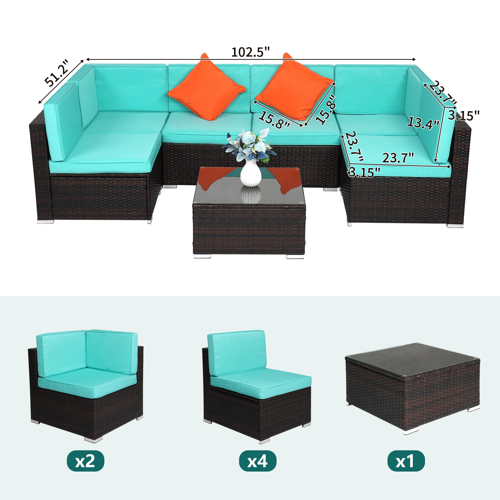 Introductions:Are you looking for a comfortable sofa set for your family? If so, this 7pcs fashion rattan sofa furniture set is highly recommended to you. Unlike normal leather sofa, this rattan sofa will give you a different using experience. Adopting high quality PE rattan and steel frame, it features stable, sturdy and durable. With soft cushion, it also can ensure softness and comfortable seating experience. It canmeet your family daily demand. So what are you waiting for? Don't hesitate, it's worth buying!Features:1. Made of high quality PE rattan and iron frame, stable, sturdy and durable2. It has a long service time, durable in use3. This chair set can meet your daily need4. Soft cushion ensures comfortable seating experience5. Concise design and exquisite workmanship6. It can coordinate with any style of decorationSpecifications:1. Material: PE Rattan Iron Sponge Polyester Cloth Tempered Glass2. Color: Brown Gradient Rattan Lake Blue Mat Transparent Tempered Glass3. Product Specifications:Corner Sofa:Overall Size: 75*75*68.5cm(L x W x H)Seat Size: 65*65*35cm(L x W x H)Back Size: 65*34*10cm(L x W x H)Seat Size: 65*65*10cm(L x W x H)Long Cushion Size: 65*38*18cm(L x W x H)Short Cushion Size: 55*38*18cm(L x W x H)Foot Pad Size: 10*10*2.5cm(L x W x H)Middle Sofa:Overall Size: 65*75*68.5cm(L x W x H)Seat Size: 65*65*35cm(L x W x H)Back Size: 65*34*10cm(L x W x H)Seat Size: 65*65*10cm(L x W x H)Long Cushion Size: 65*38*18cm(L x W x H)Foot Pad Size: 10*10*2.5cm(L x W x H)Tea Table:Overall Size: 65*65*34cm(L x W x H)Glass Size: 64.2*64.2*0.5cm(L x W x H)4. Product Bearing Capacity:Sofa: 150kgTea Table: 75kg5. Weight: 29.7kgPackage Includes:2 x Middle Sofa2 x The Seat Cushion2 x Long Cushion1 x Tea Table1 x Tempered Glass2 x Hold Pillow1 x English Instruction Manual1 x Assembling Hardware Accessories