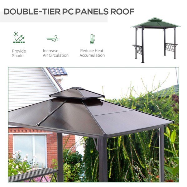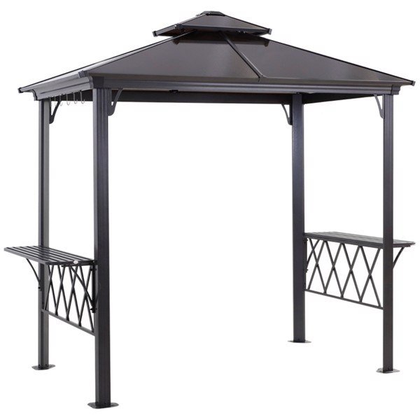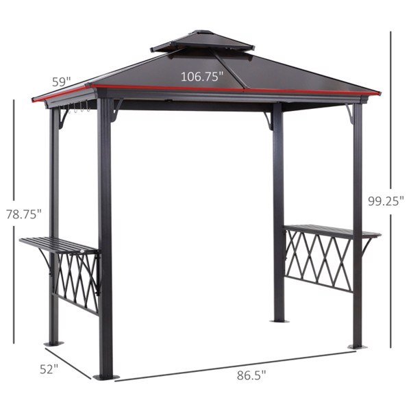 Features:- 8.9 ft x 4.9 ft space gives enough room to accommodate most grills- Vented, with the double-tiered canopy offers smoke ventilation and stability against windy conditions- Durable aluminum and metal frame for added stability- Comes with screws for the legs for added support- 2 platform shelves for grill accessories, beverages, or food- 6 hooks for cooking tools- Assemble required- Note: Not to be left up during adverse weather conditionsSpecification:- Color: Black, Coffee- Materials: Aluminum, Metal, Polycarbonate- Overall Dimensions: 8.9' L x 4.9' W x 8.3' H- Inner Spacing: 8.4' L x 4.4' W- Peak Height: 8.3 ft- Sidewall Height: 6.6 ft- Net Weight: 81 lbs