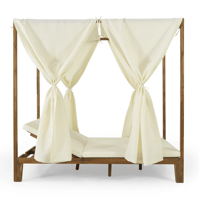 This outdoor seating features two adjustable chaise lounges topped with plush water-resistant cushions and is finished with a sturdy box frame, allowing you to hang our curtains to provide plenty of shade for you to relax outdoors