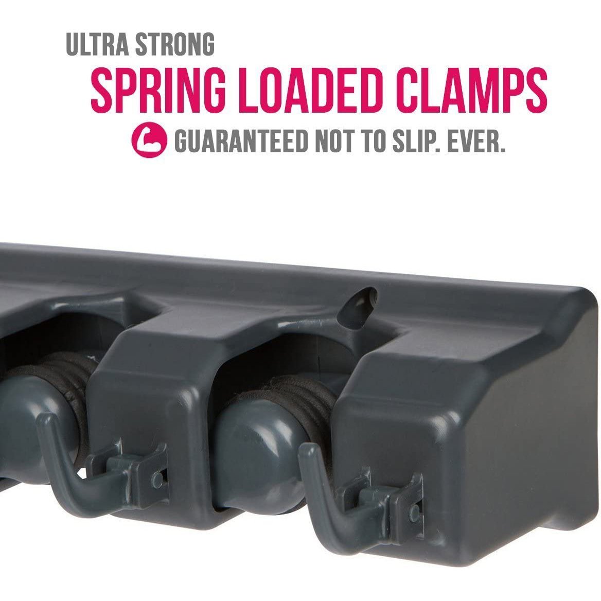 3.capacity. Thanks to the spring loaded, double rubber gripped slots, the utility hooks can hold anything from wet mops and dirty rakes to baseball bats, without any annoying slipping.