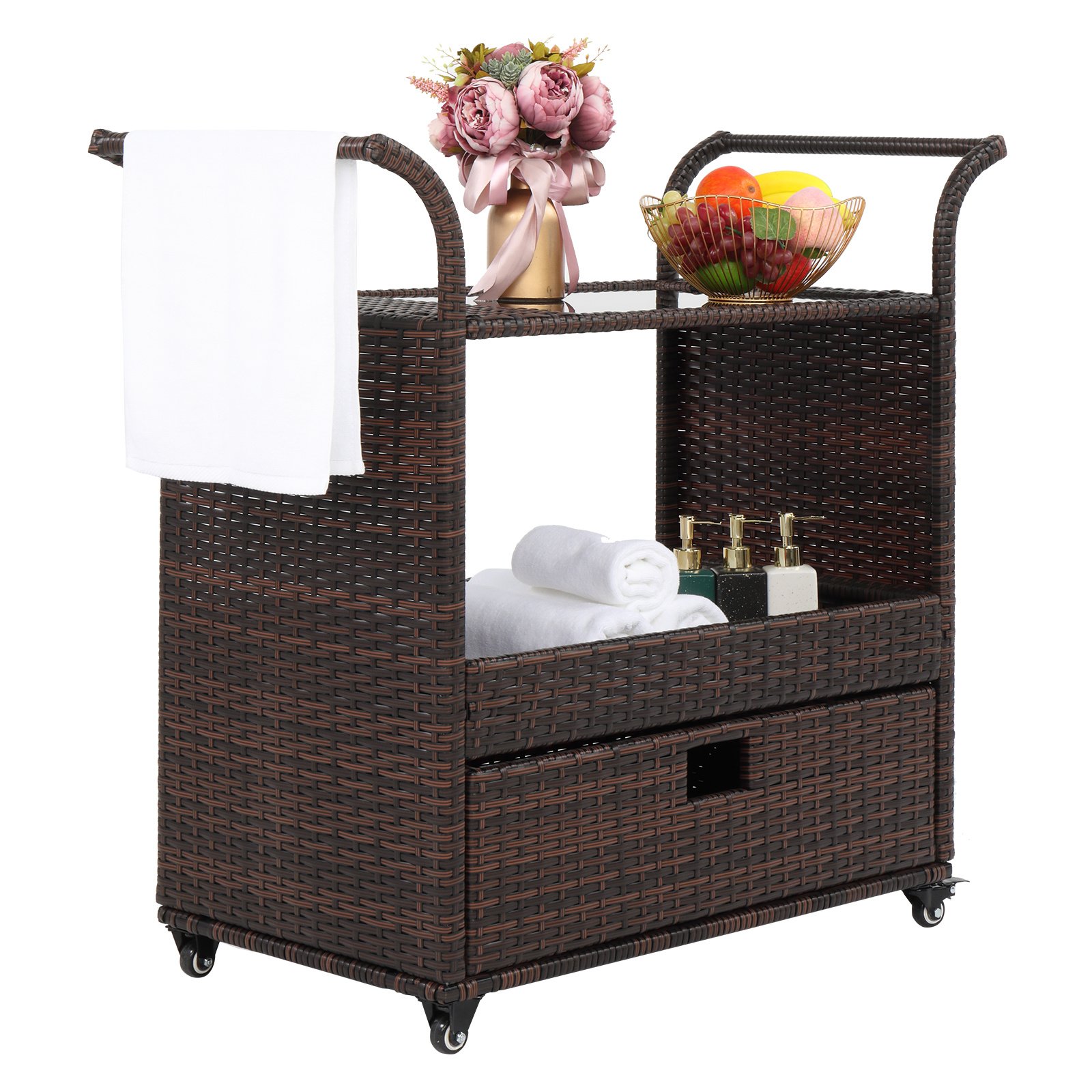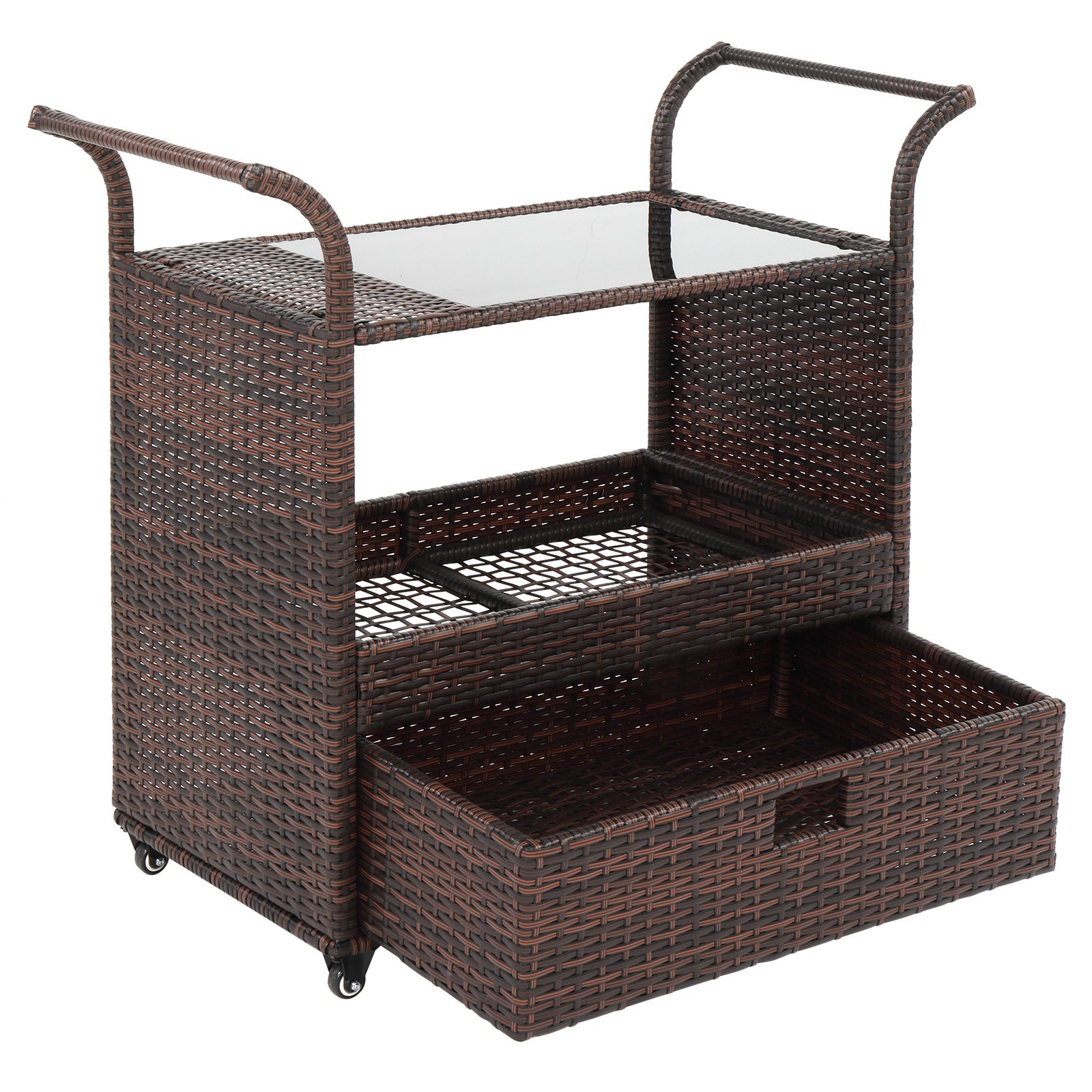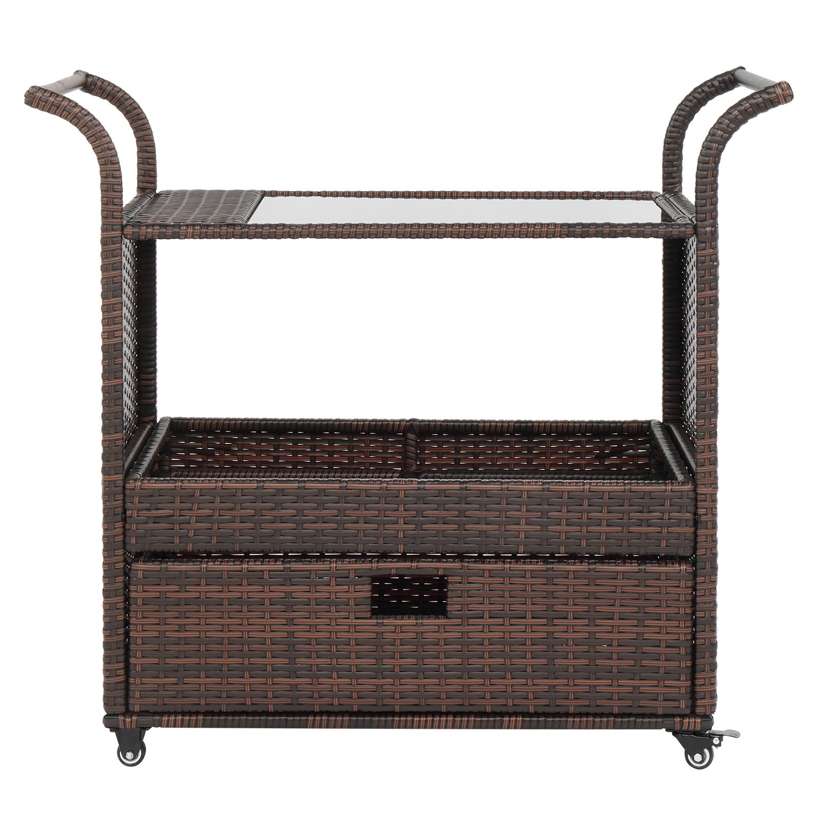 Outdoor Patio Wicker Rattan Serving Bar Cart Sideboard On Wheels Brown Gradient