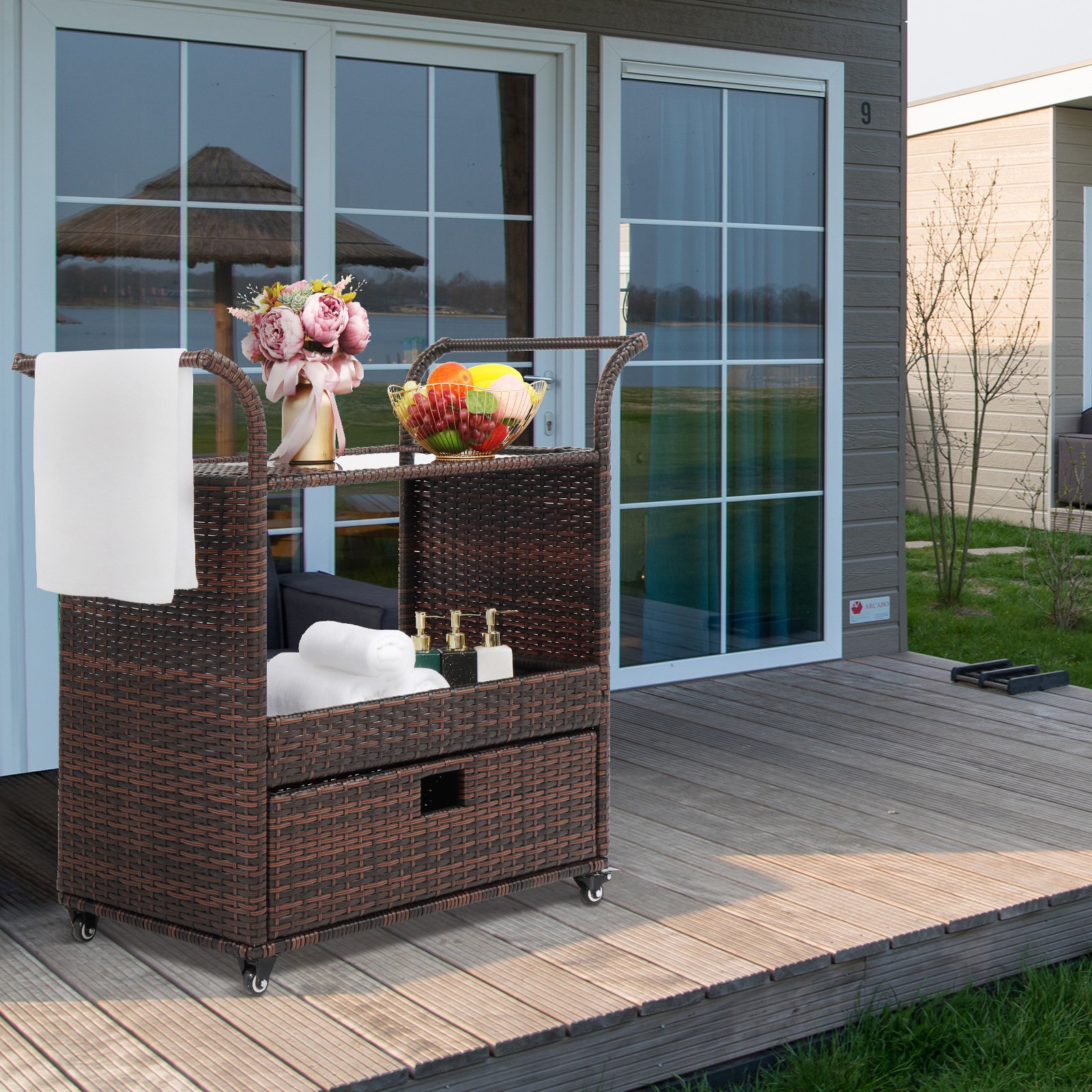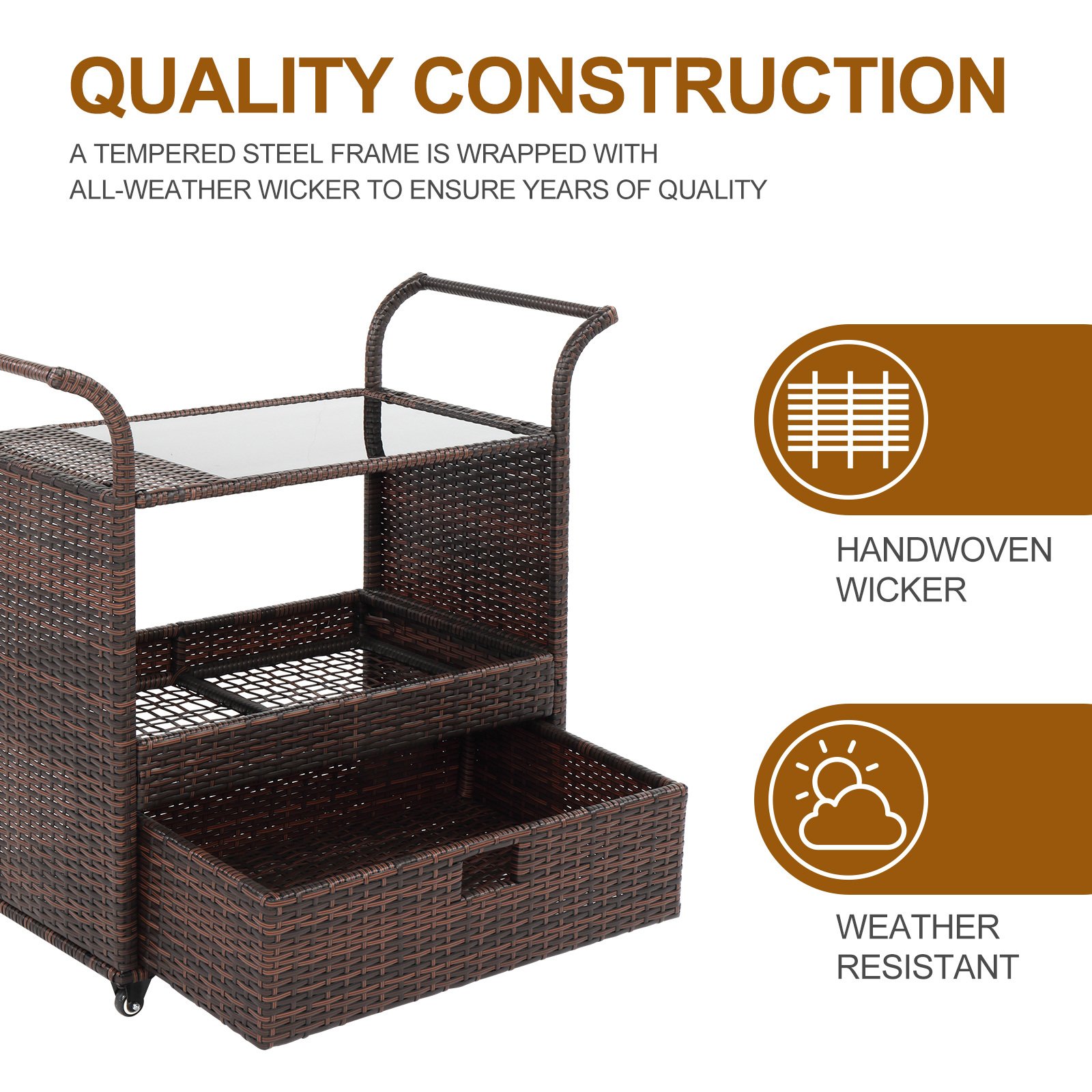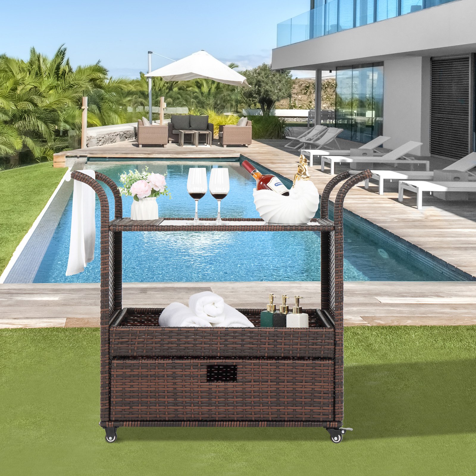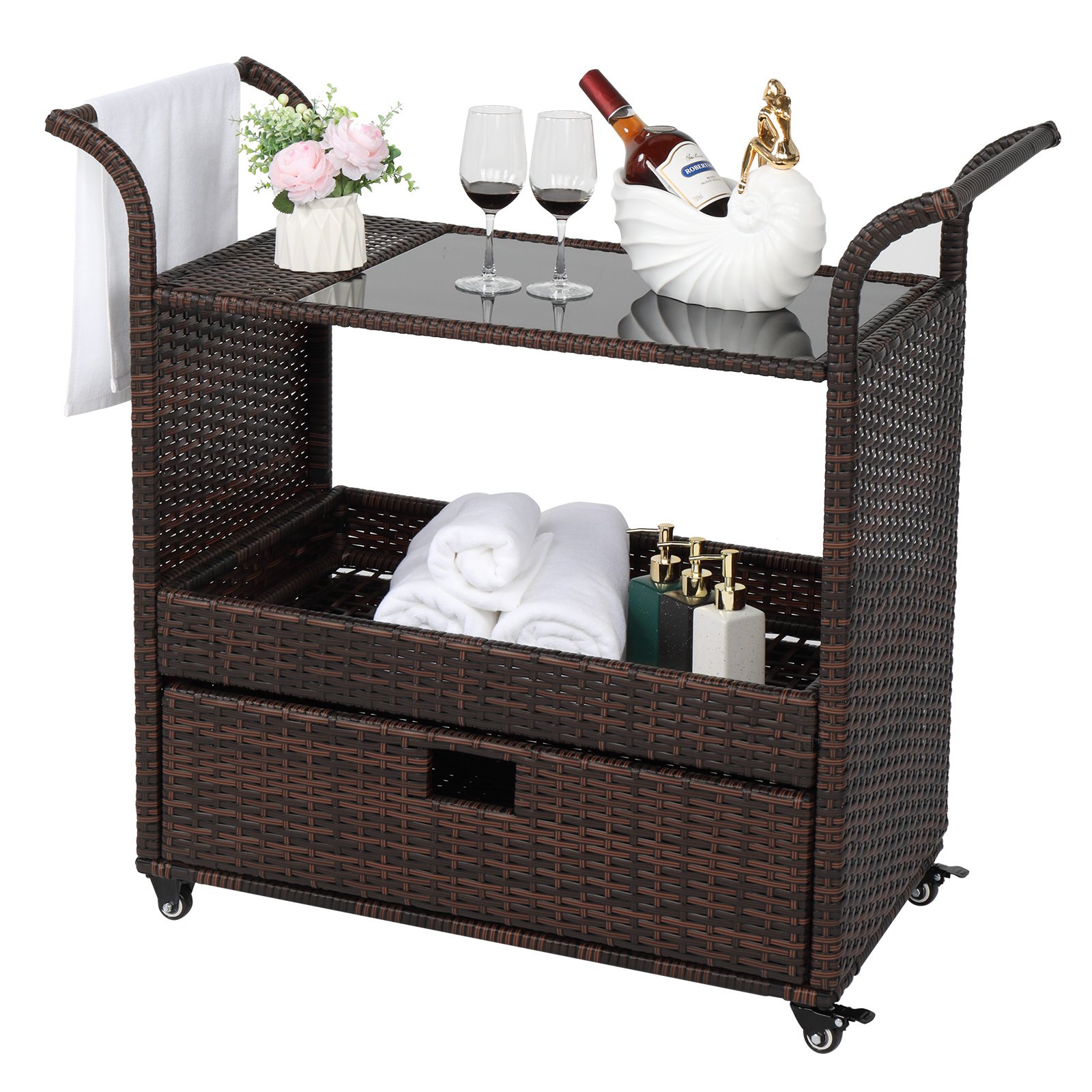 Outdoor Patio Wicker Rattan Serving Bar Cart Sideboard On Wheels Brown Gradient
