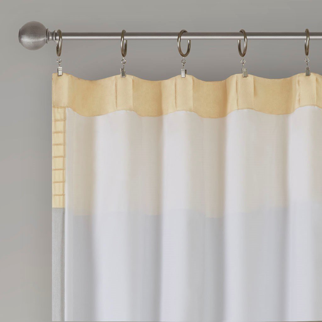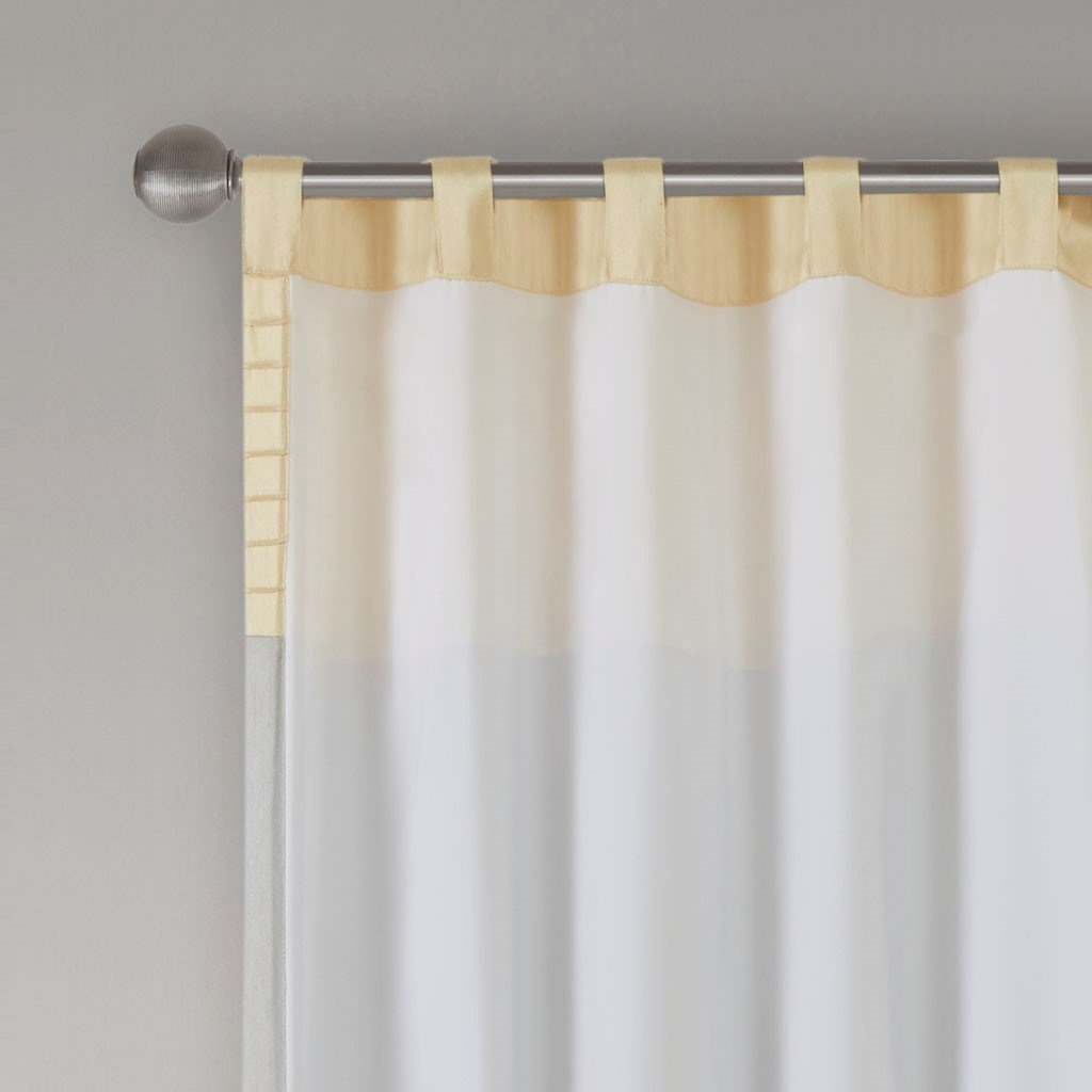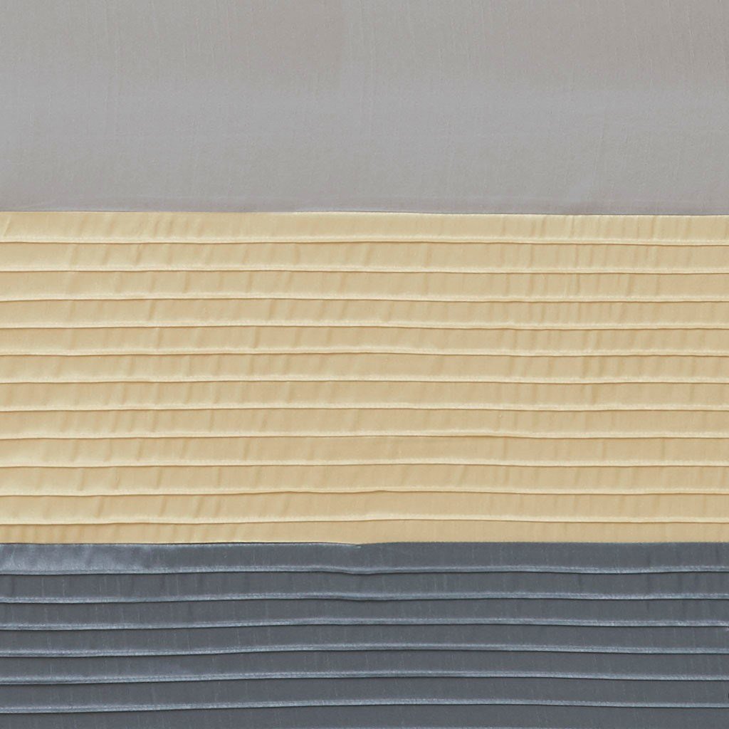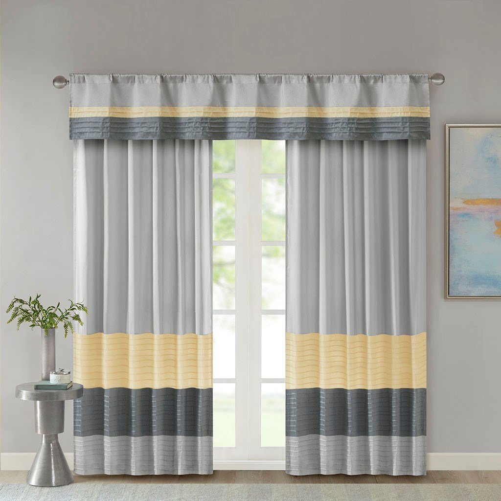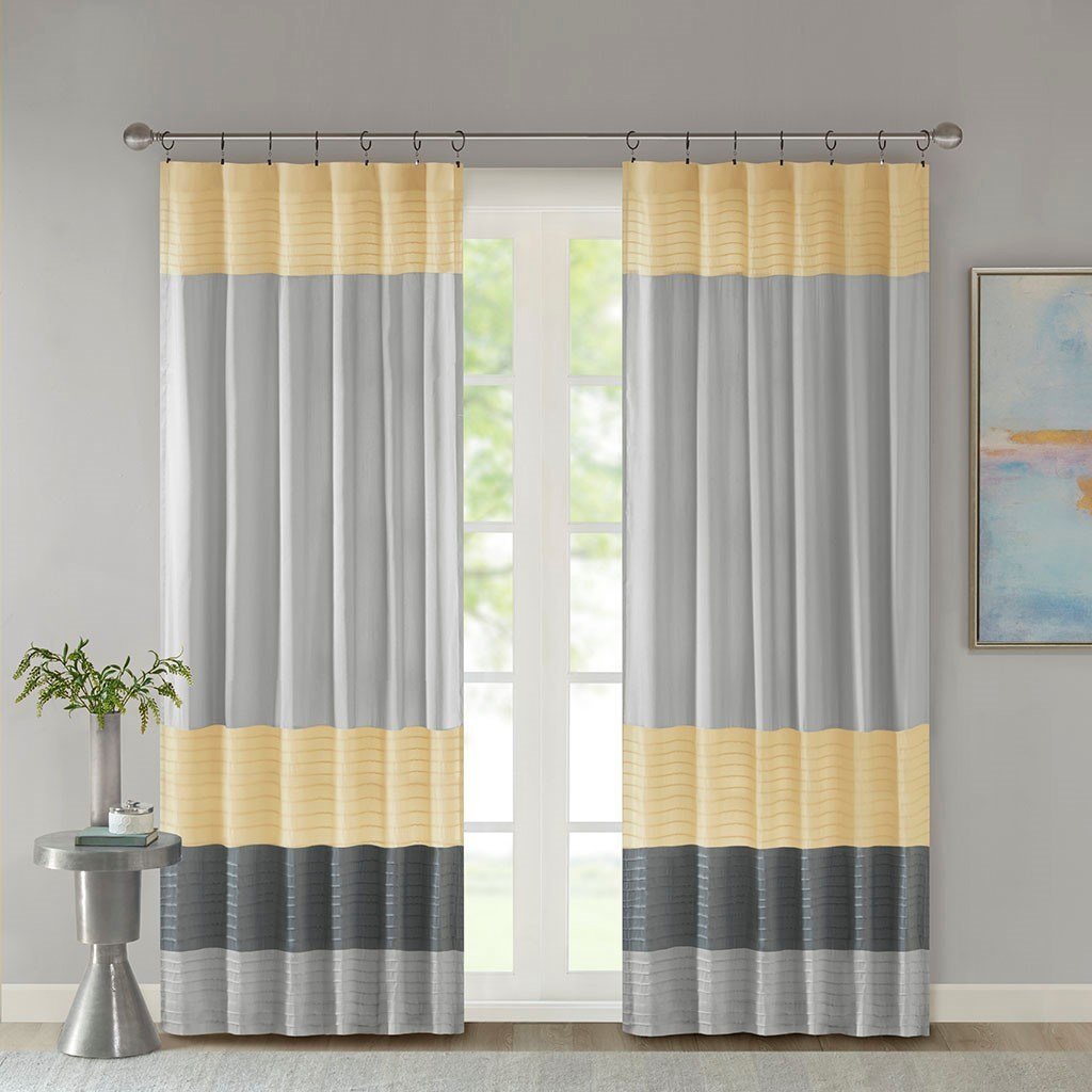 DescriptionAmherst's modern color block design is a simple way to add style to your room. This window panel features color block stripes in hues of grey and yellow, combined with pintuck detailing for beautiful texture and dimension. Added lining helps to filter the perfect amount of light and creates a fuller look. Hang using the rod pocket or back tabs for a tailored look. Fits up to 1.25" diameter rod.Product Details50x84"1 Window panel:50x84" Rod pocket and back tabsMaterialFaux Silk