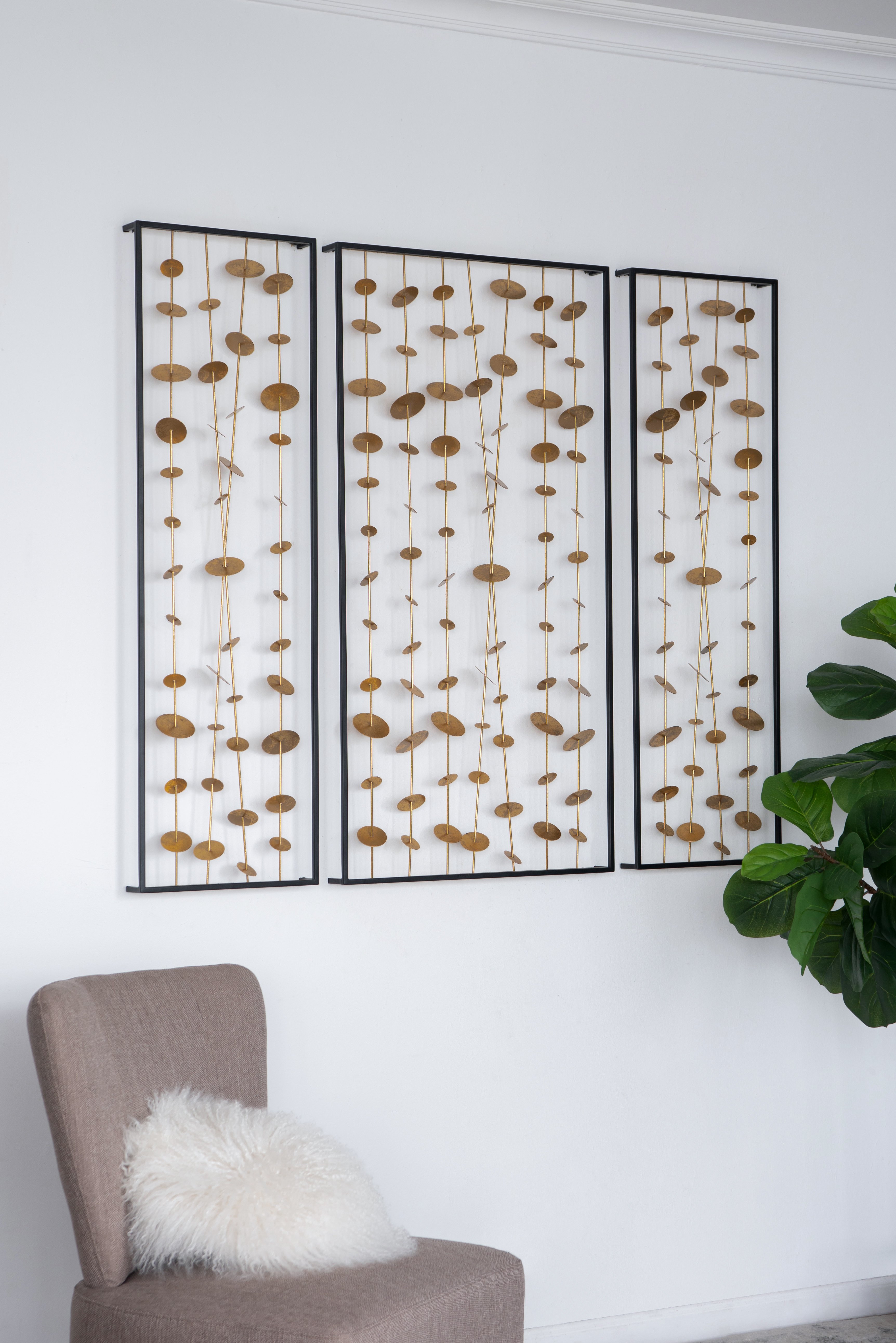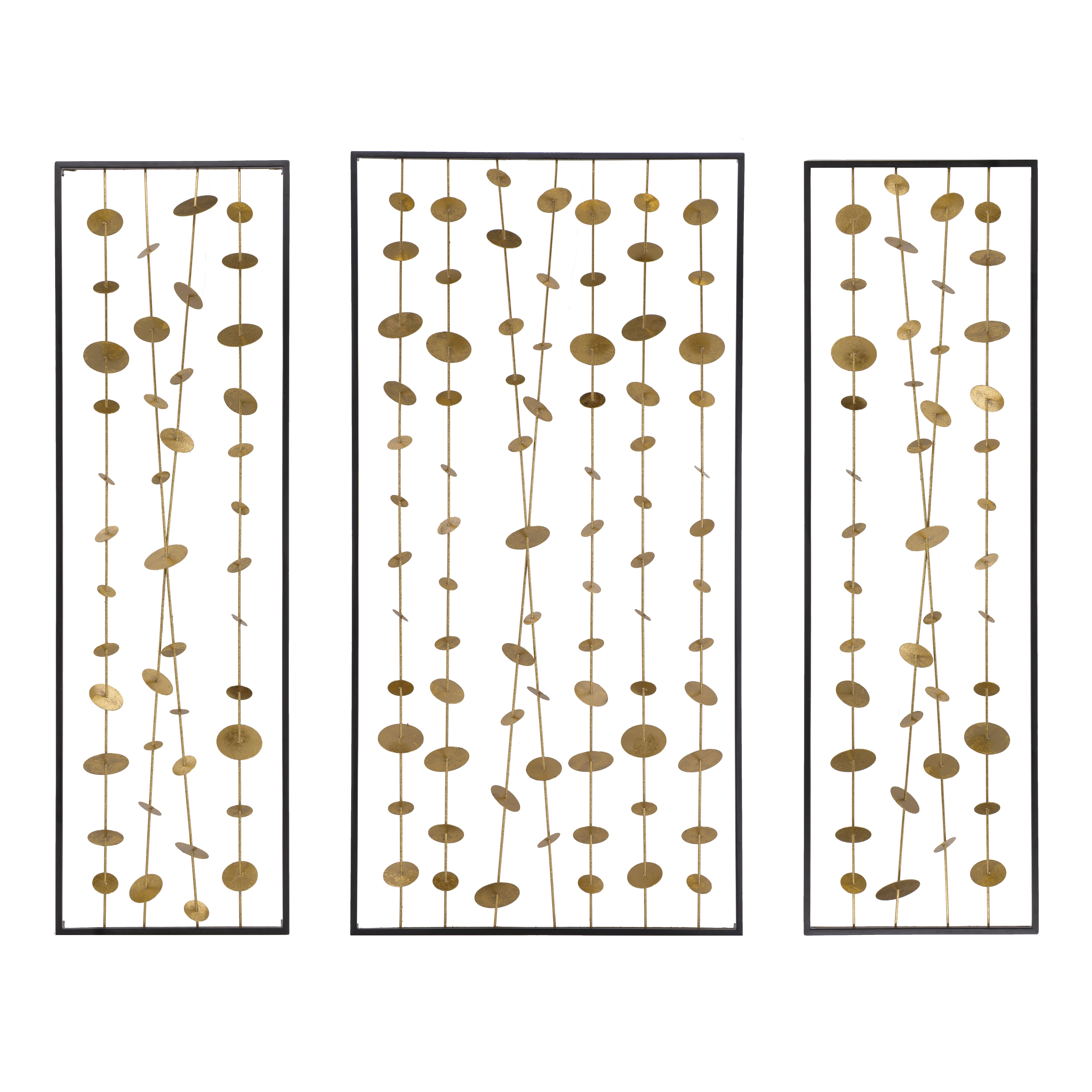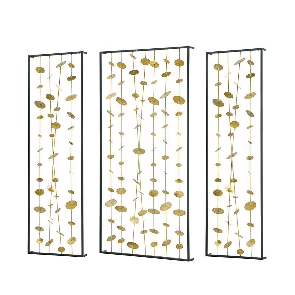 The DesignInspired by wind chimes, iron disks with a gold finish cascade in delicate garlands above a sofa or entryway table. Hang the Kristos set of 3 metal wall art in any room to add sculptural dimension and intriguing shadows.