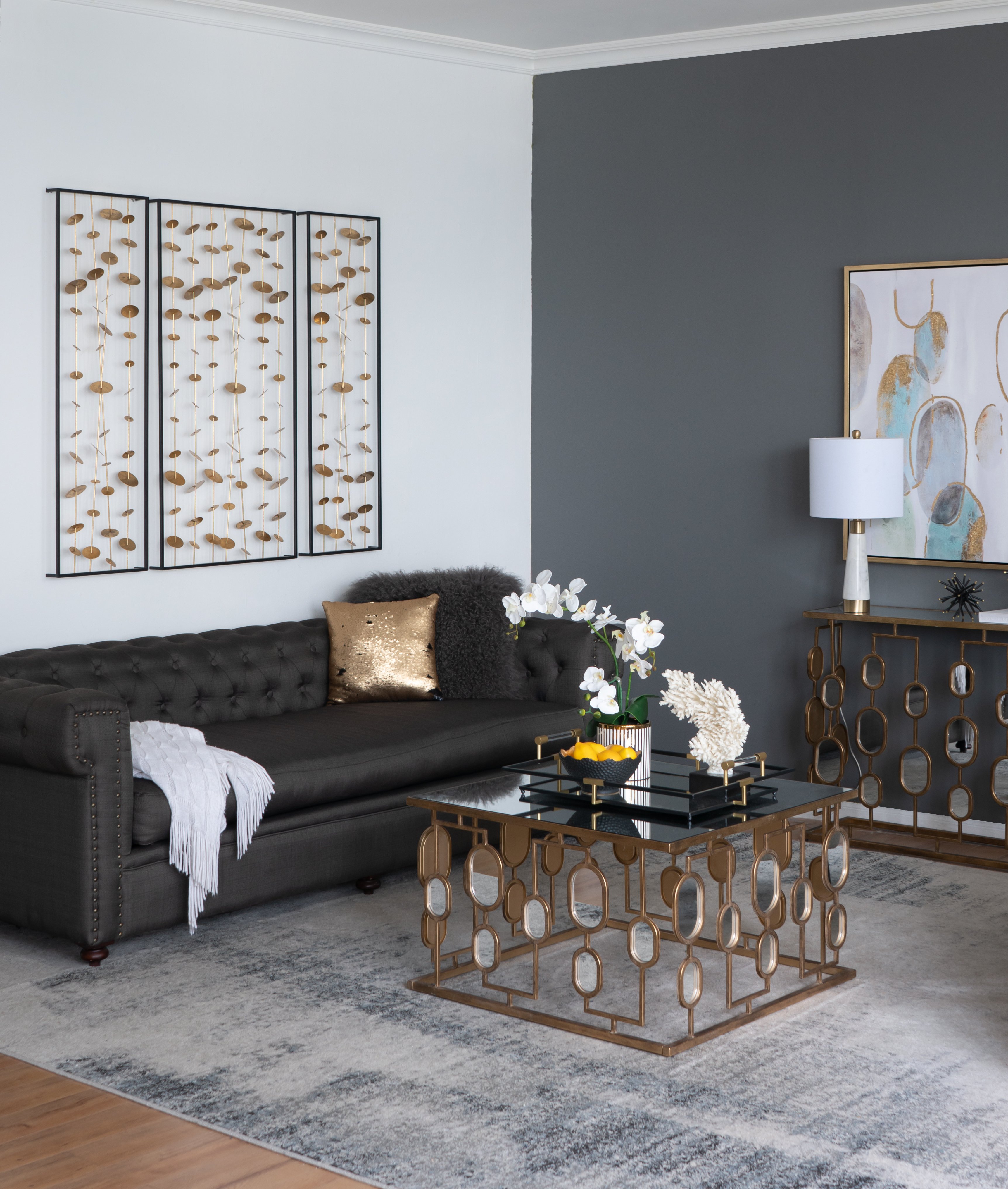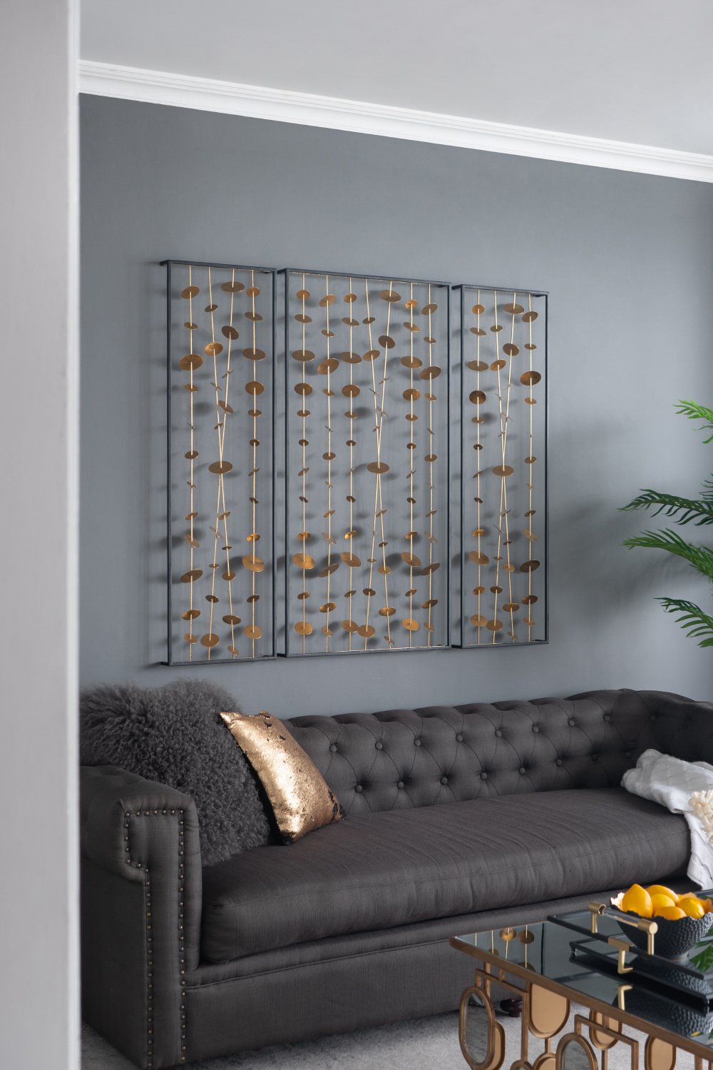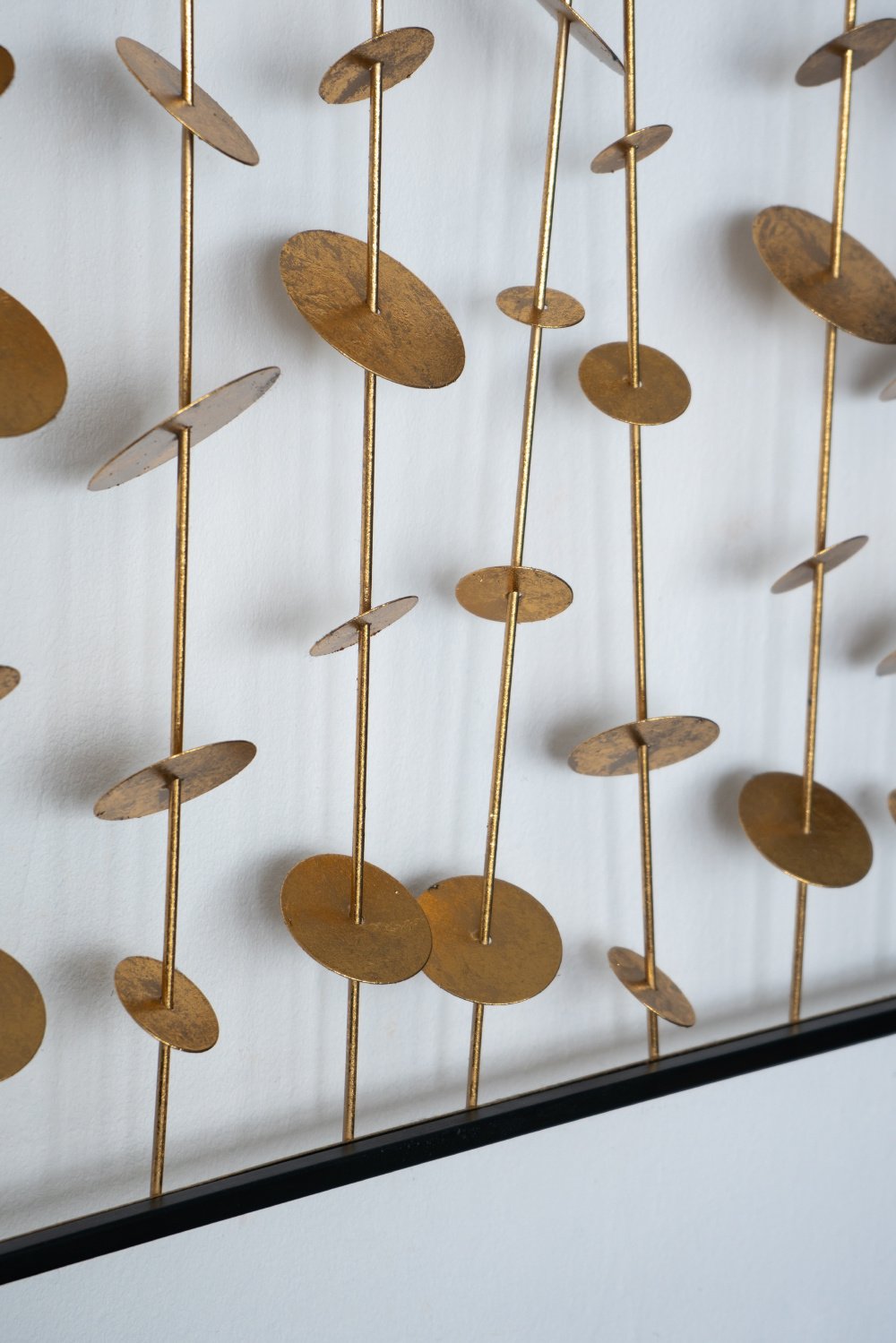 The DesignInspired by wind chimes, iron disks with a gold finish cascade in delicate garlands above a sofa or entryway table. Hang the Kristos set of 3 metal wall art in any room to add sculptural dimension and intriguing shadows.