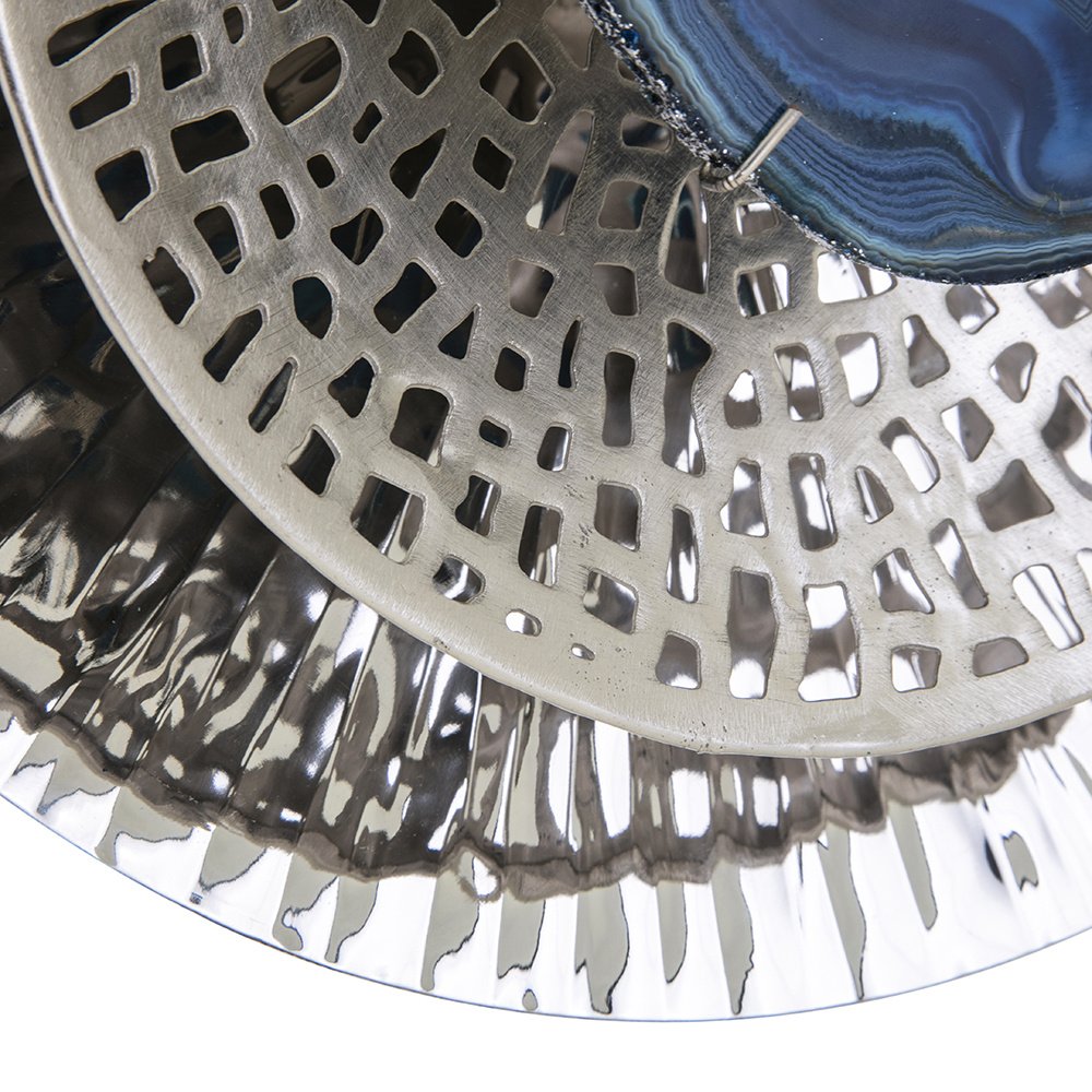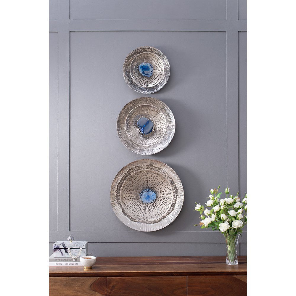 The DesignTransform bare wall spaces into stunning focal points with the Dex wall decor set. These gorgeous pieces feature aluminum discs in a metallic silver finish with an abstract radial design and agate centerpieces in multiple hues of blue, blending well with a variety of styles and color schemes. Mounting hardware is concealed at the back for a finished presentation