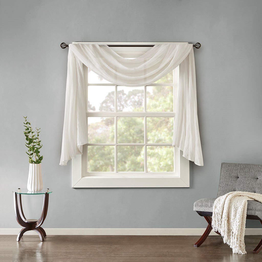 DescriptionSoften the edges of your window, with our Madison Park Harper Solid Crushed Sheer Scarf. This crisp white scarf features crushed detailing for beautiful texture, while the lightweight sheer fabric provides easy draping and an airy touch to your decor. Four tabs are also included to make the DIY assembly easy so you can drape the scarf to best fit your window. For a complete look, layer this scarf with coordinating panels or prints in our collection for a more custom appeal.Product Details42x216"1 Window Scarf:42"W x 216"LMaterial100% Polyester