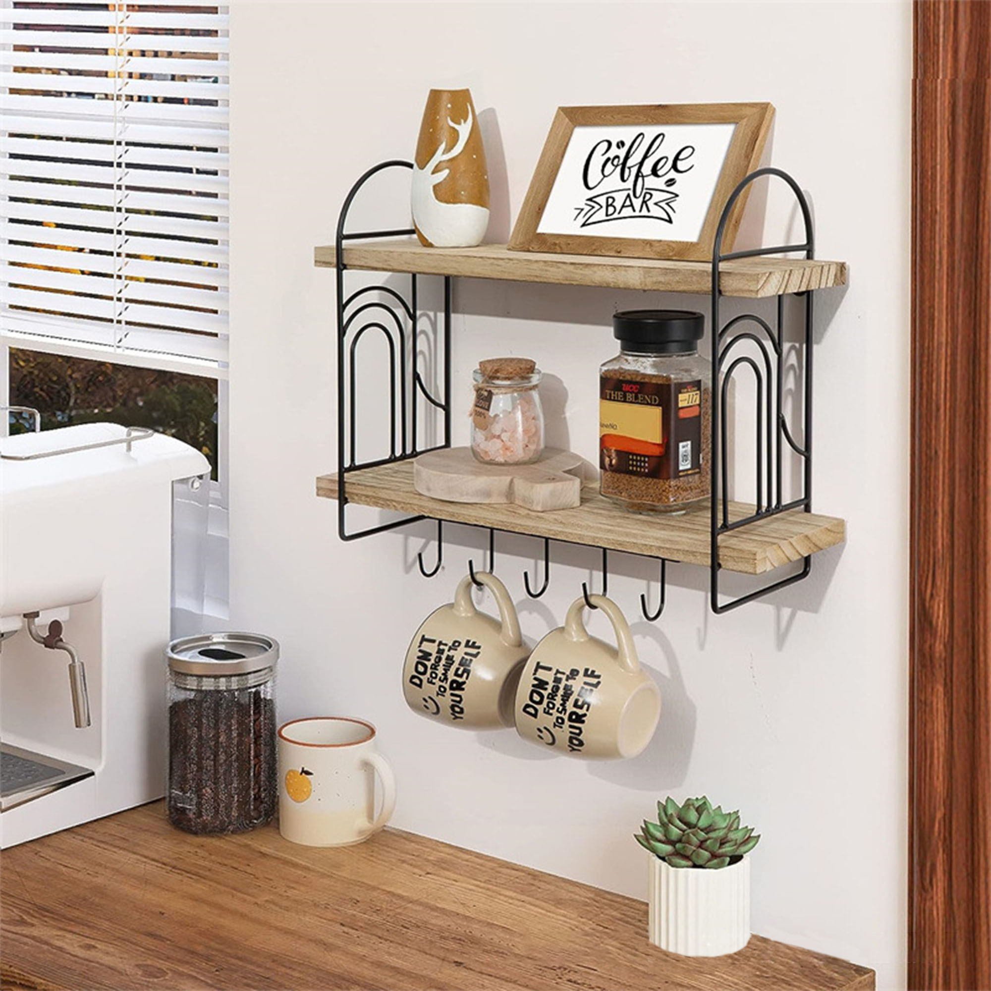 2.[Wall Mounted Coffee Cup Holder] - Removable hooks provide ample space for storing coffee cups, and your favourite coffee bags, coffee pots, and other coffee supplies can be neatly arranged on the shelf, this rustic and adorable shelf will add the perfect touch to your coffee bar.